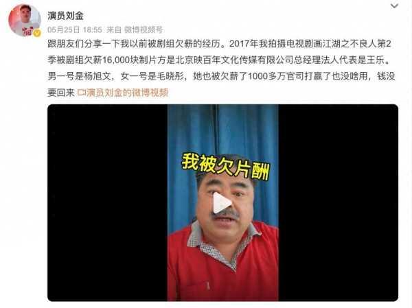 5月25日,演员刘金发布微博,爆料自己在2017年被《画江湖之不良人》第二季剧组欠薪16000元,至今未要回。