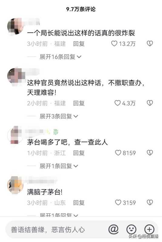 窦某的言论引起网友热议,“一个局长说出这样的话,真是很炸裂”;“局长茅台喝到头了”;“窦局这是要火啊”。