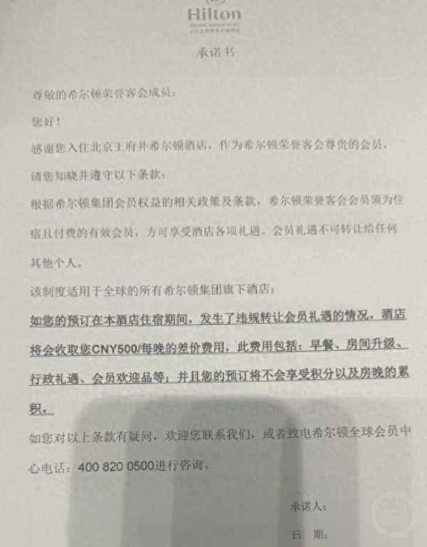 5月24日,记者以消费者身份致电北京王府井希尔顿酒店问询,工作人员表示:“根据顾客签署的承诺书,工作人员调监控发现顾客夜不归宿,怀疑其转让会员价房间让补差价,这是保护其他会员权益而做的基础内部审核。我们会甄别一些不太合法、合规地使用希尔顿会员权益的那种顾客……我们肯定是要去维护酒店会员权益的,有必要的时候要去审查一下……希尔顿总部集团包括会员中心也是鼓励我们,支持酒店这样去做的。”