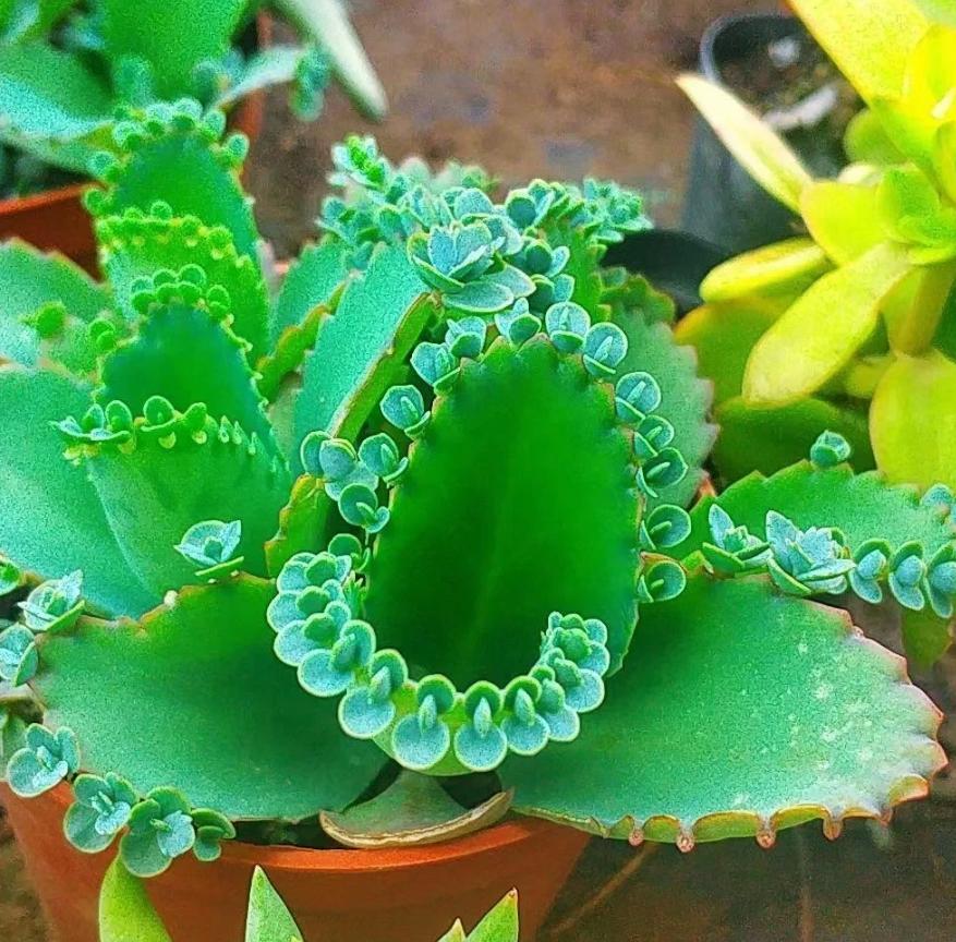不死鸟,学名落地生根,是多肉植物中的一种。它的叶片边缘会长出小芽,这些小芽一旦落地就能生根发芽,繁殖能力惊人。不死鸟不仅生命力顽强,其独特的形态也颇具观赏性。