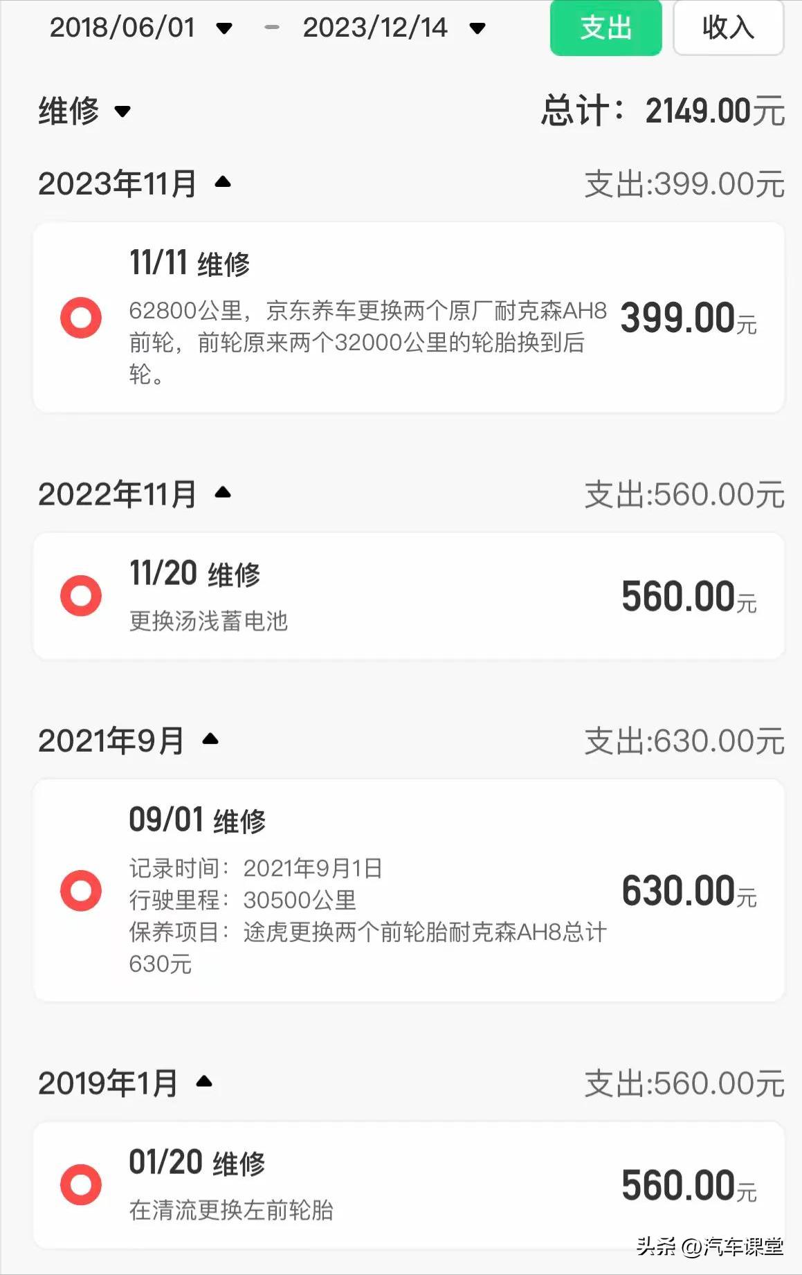 保养及维修: 定期保养花费2000多元,维修更换轮胎和灯泡共花费2100多元。