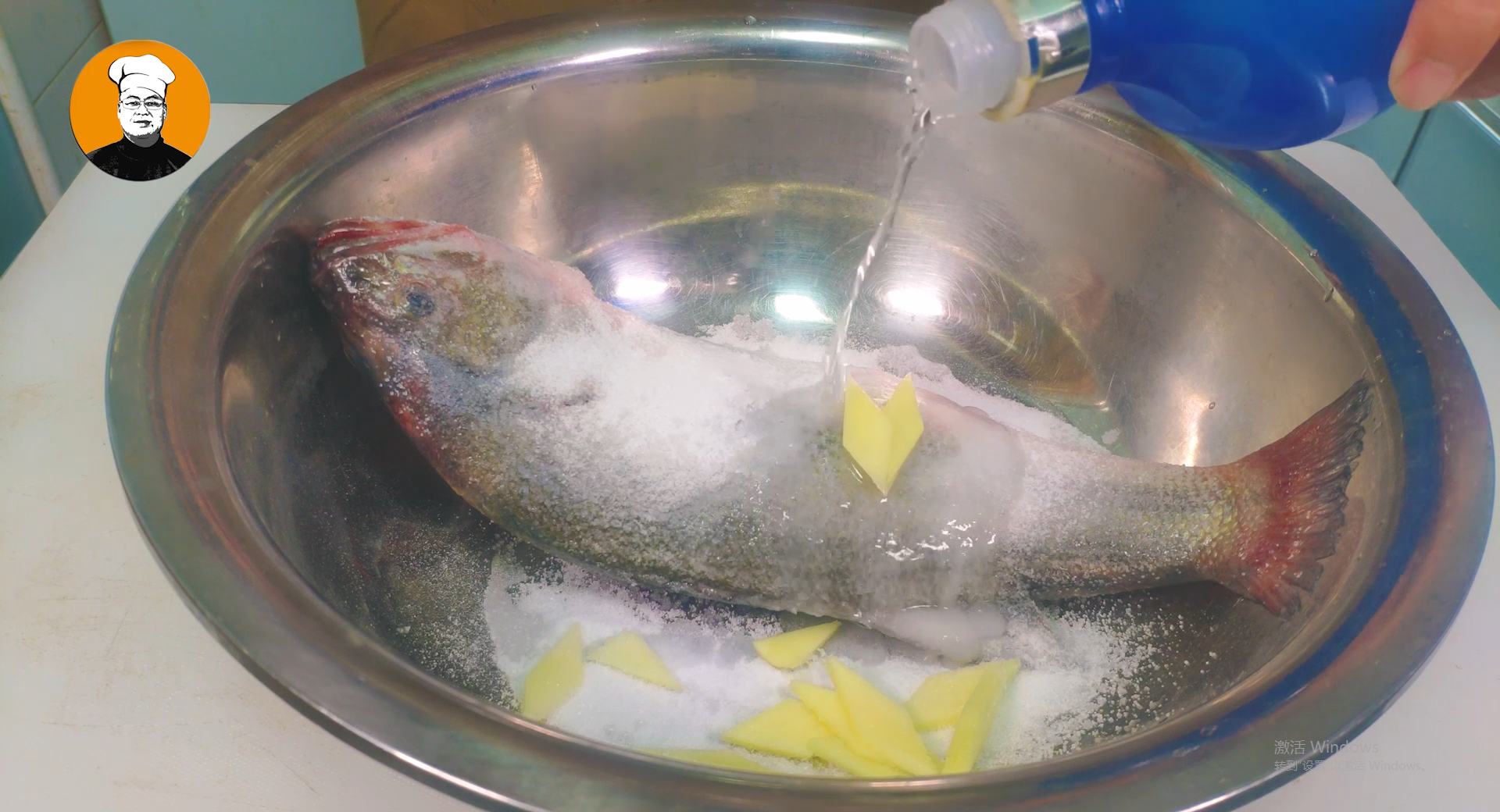 4、先把处理干净的鲈鱼放入盆中爆腌下,先放入食盐盐量要多一点、姜片、食用小苏打,放入小苏打可以使鱼肉更加嫩滑,淋入少许高度白酒,再 放入淘米水,水量要漫过鱼身,搅拌一下把盐搅拌均匀,腌制两个小时