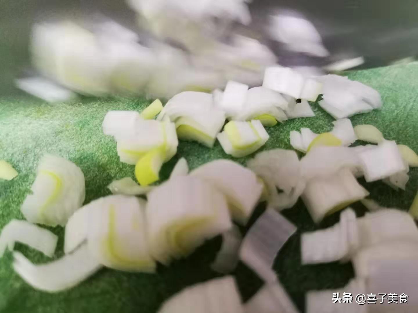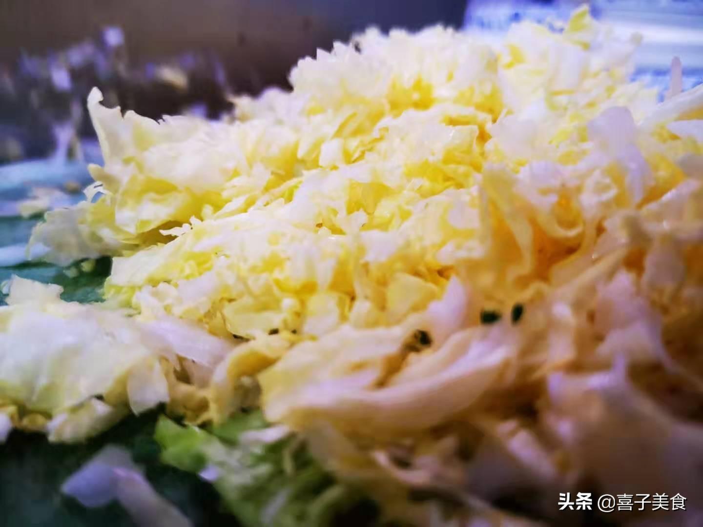 第1步,我们首先将白菜取叶洗净,顶刀切成细丝,切成丝的目的是为了让白菜能够快速的成熟,大葱切成末备用