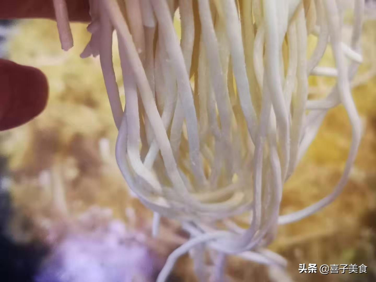 在这里教大家一个小窍门,看面条熟不熟,你可以用筷子夹出一根,然后用筷子把它夹断,看一下他的横断面里边有没有,白色的硬芯,如果没有心就证明面条已经成熟了。