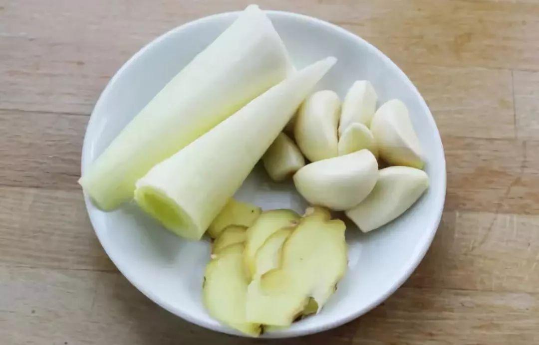 3、大葱切段,生姜切片,蒜瓣剥好。