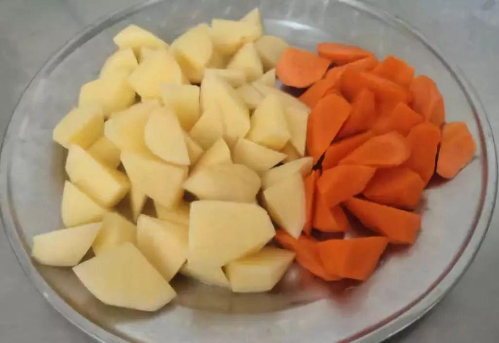 4、胡萝卜和土豆切成滚刀块。