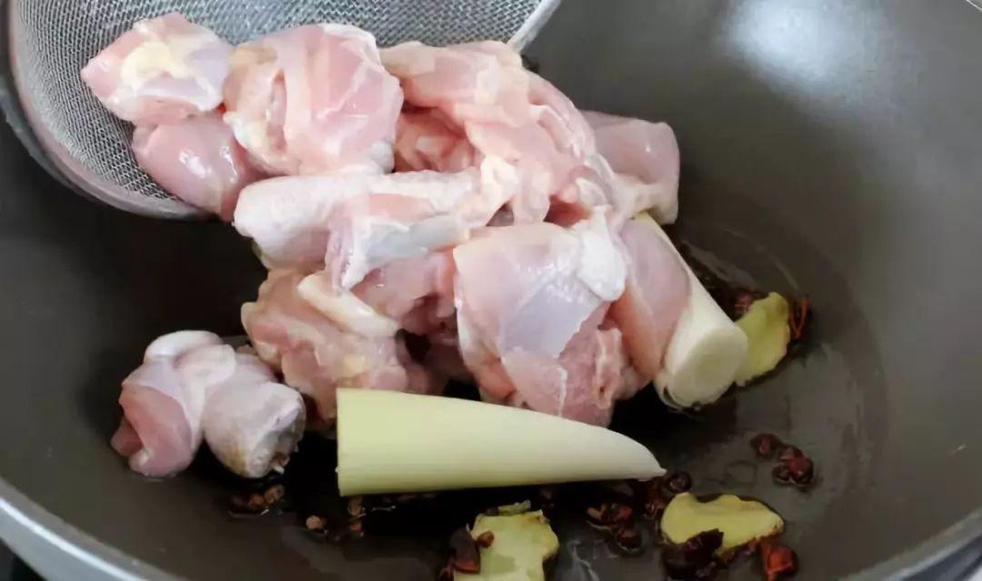 7、油烧热之后,将大葱和鸡块下锅炒。