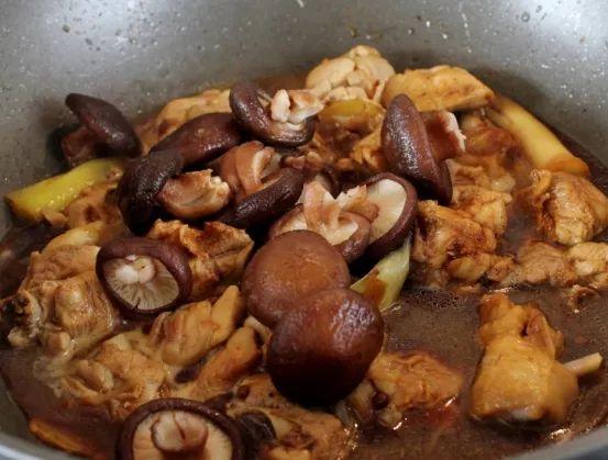 8、翻炒一会,加入米酒、酱油、盐、糖调味,然后倒入香菇和泡香菇的水,盖上锅盖,大火煮开后改小火焖10-15分钟。