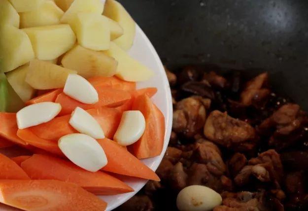 9、加入土豆、胡萝卜、蒜瓣,盖锅盖焖至土豆和胡萝卜变软。然后倒入青椒,翻炒均匀即可出锅。