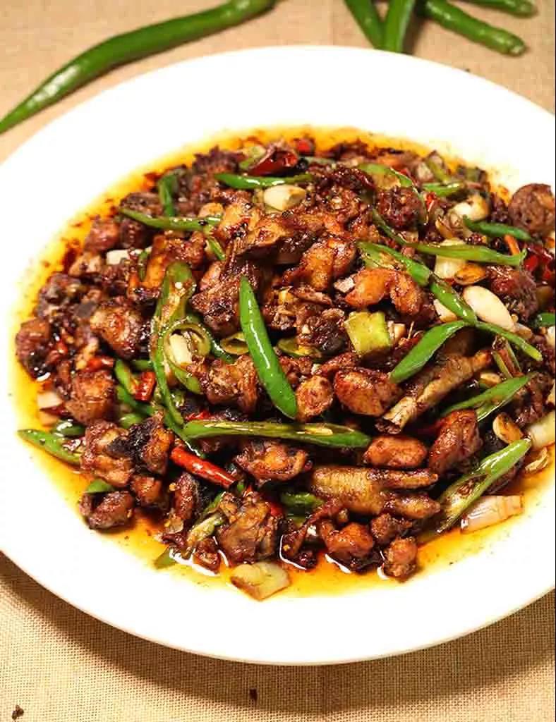 熟处理: 锅内放入大豆油150克,烧至五成热时,先放入大姜10片煸炒出香味,下入鲜花椒50克,中火炒出花椒香味后,下入花椒酱100克,炒出酱香味后下入鸡肉块,中火炒至鸡肉水分散发掉,倒入骨头汤没过鸡块,大火烧开,改小火烧20分钟左右,下入青尖椒块80克、小米椒段50克,翻炒均匀,淋芝麻油10克即可上桌。