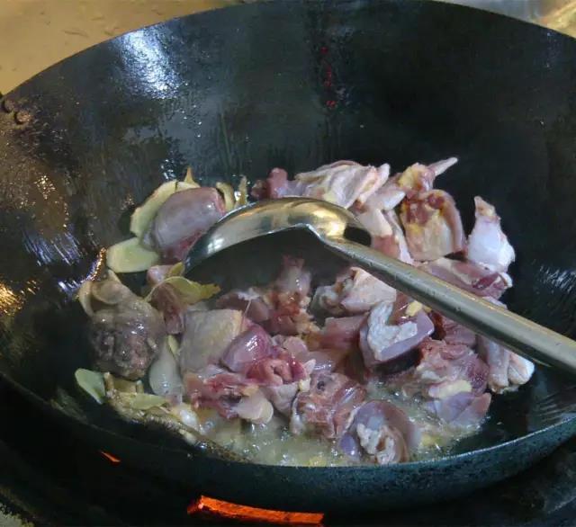 初加工 :取农家饲养的小公鸡(饲养时间在1年左右)宰杀制净(净重在1.4千克-1.5千克),剁成4厘米见方的块。