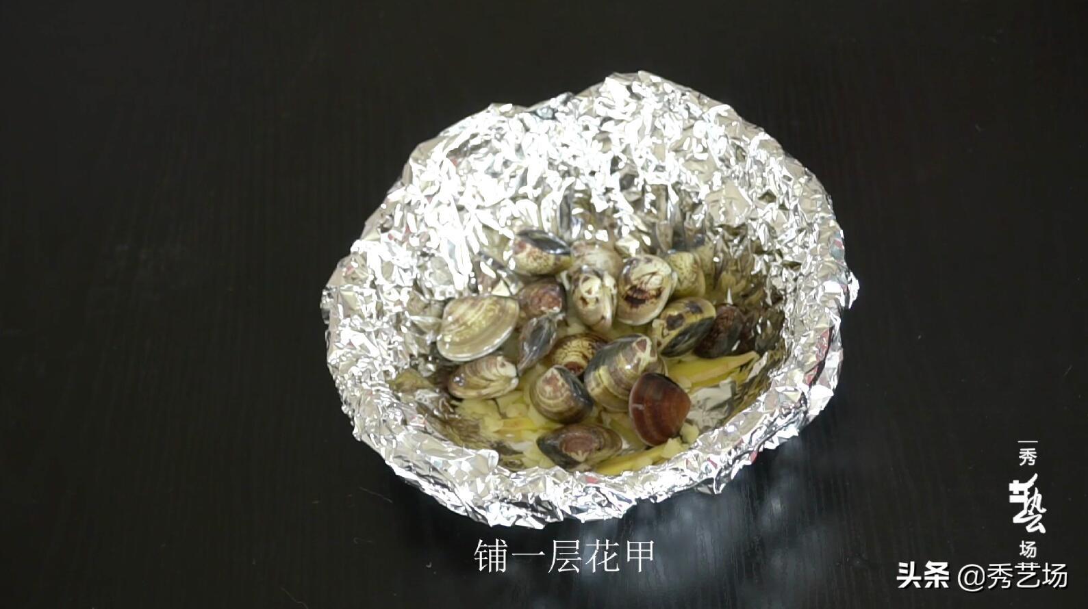 - 取两张锡纸叠加在一起做成碗的形状,在锡纸底部上姜丝、蒜末,铺一层花甲。