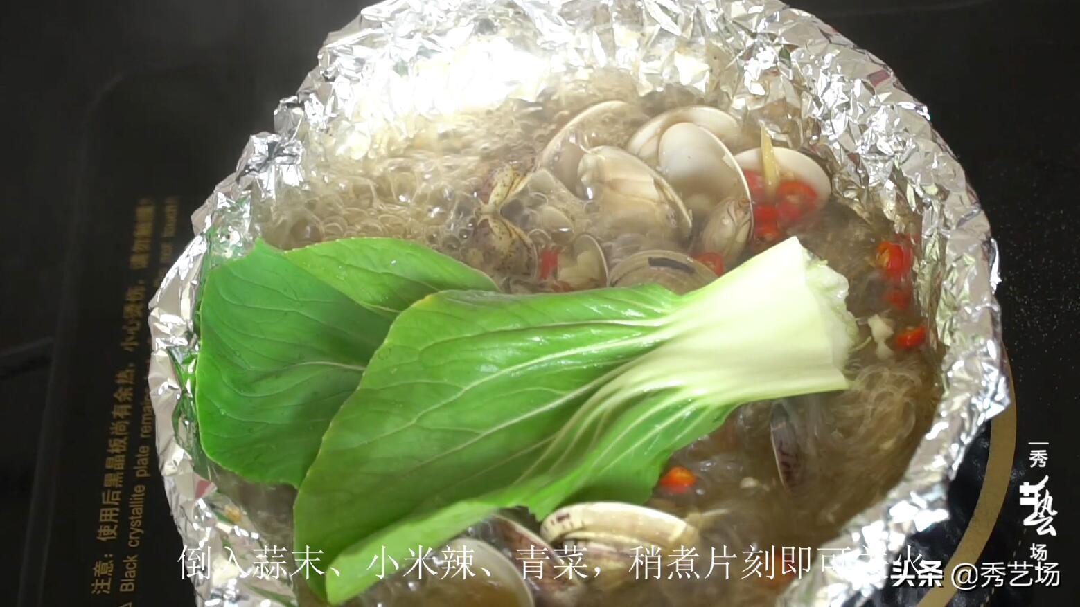 - 加一小把泡软的粉丝,再盖一层花甲,准备好后放在电磁炉上,加一勺生抽、料酒、食用油、耗油,适量黑胡椒调味,倒入清水没过食材即可