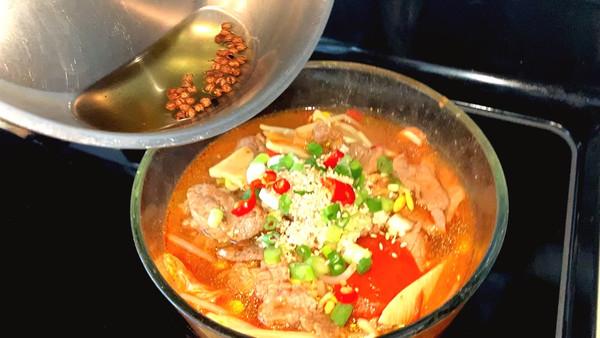 10、起锅,起个小油锅,花椒炸出香味,把热辣辣的油倒入水煮牛肉,空气中弥漫着浓浓的的香辣味,赶紧吃吧,太美味了!