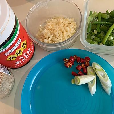 1、葱、姜、蒜、辣椒、大葱,备用。芝麻、辣豆瓣酱备用。