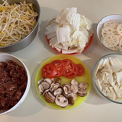 2、黄豆芽、白切、藕、笋、蘑菇、蕃茄洗、切备用。牛肉切片用蚝油、酱油、淀粉、盐、味精、鸡蛋清、料酒、麻油、白胡椒粉拌匀腌制2小时以上。