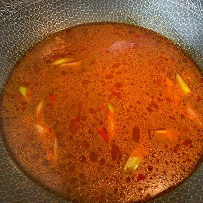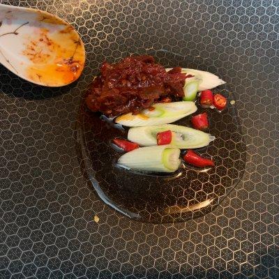 3、热锅热油,加入大葱、辣椒、一匙辣豆瓣酱炒出香味。