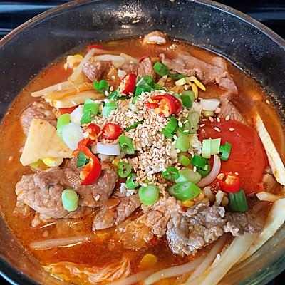 9、加牛肉片,一片片加入。全部加入后煮2分钟。