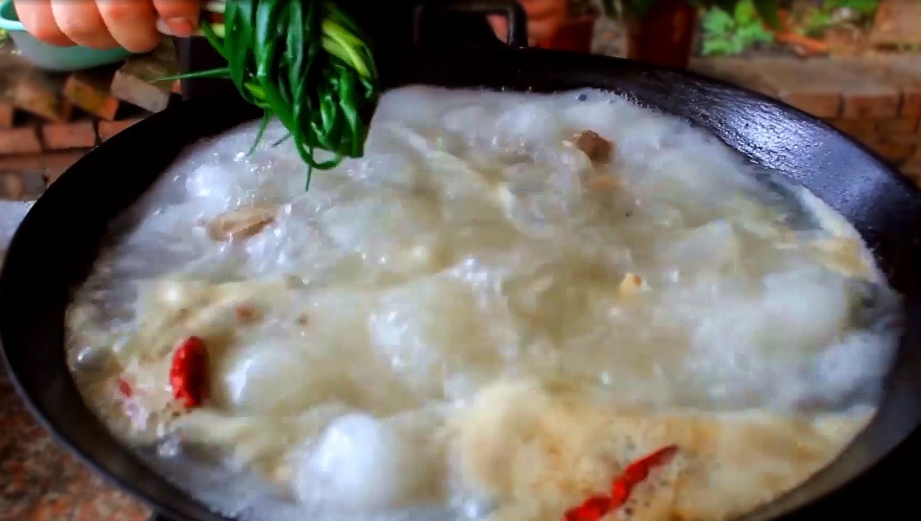 4、加水,水开之前下入料酒、拍过的老姜、2个干辣椒(能更好的去腥增香)、少量花椒,小葱烫一下,挽成成葱结放到里面。水开之后再次捞去浮沫,然后继续大火熬5分钟把汤熬白。