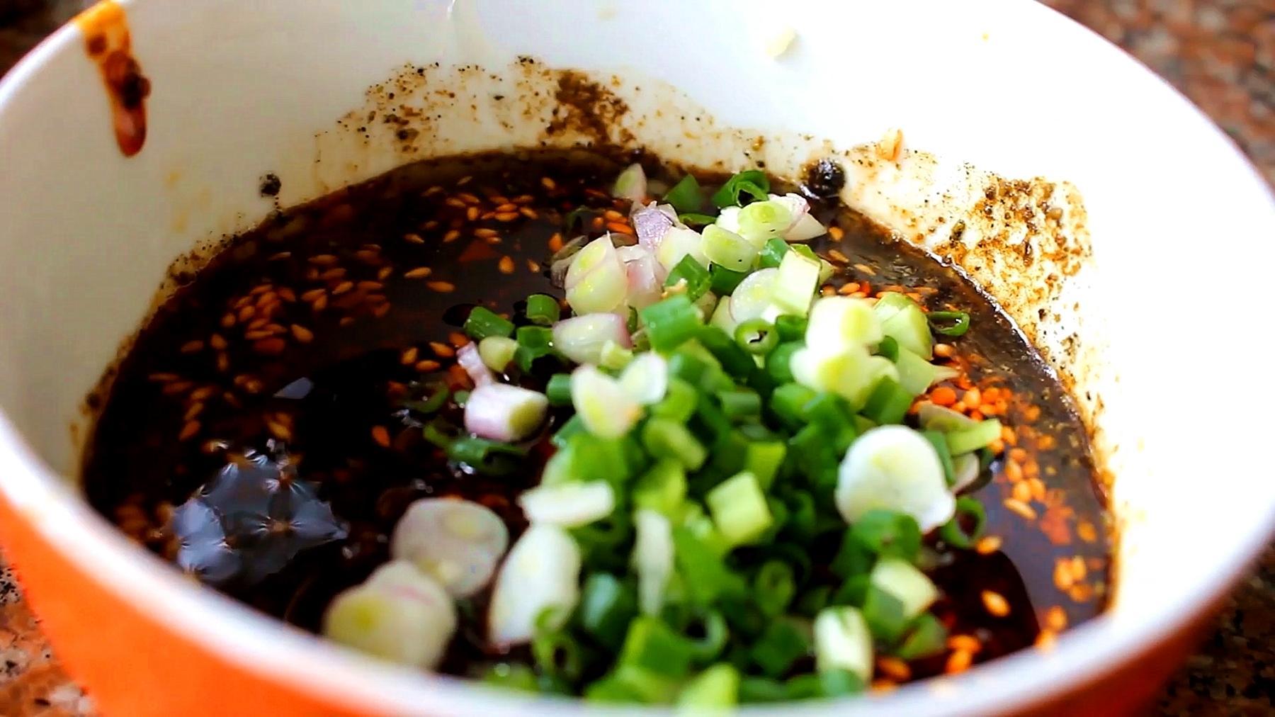 7、觉得太清淡再调一个万能蘸水:大蒜拍碎剁成蒜泥,放入小碗中,加适量盐、生抽酱油、花椒粉、花椒油、香油、醋、香 辣红油、葱花、白糖、味精。