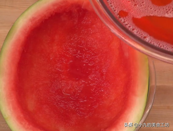 用勺子过滤掉表面的气泡,然后将西瓜汁倒入西瓜皮中,再包上保鲜膜,放进冰箱中冷藏2个小时,等定型之后咱们的【西瓜果冻】就做好了,取出切块,绝对是孩子们的最爱,保证好吃得停不下来;