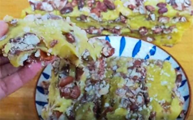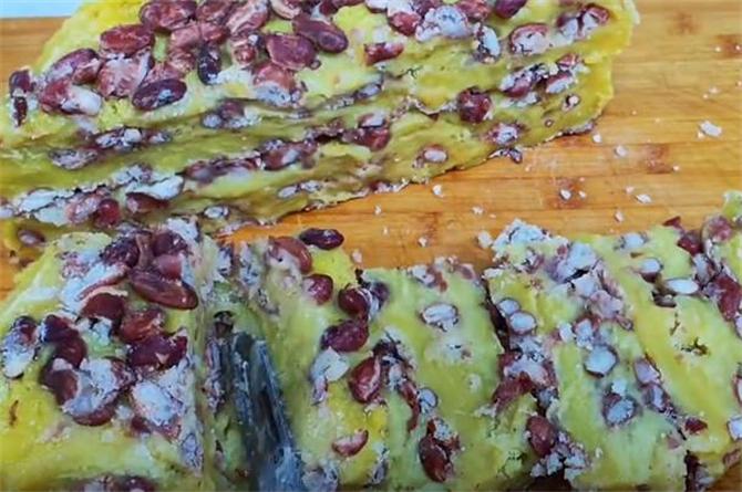 10.刚出锅的切糕蘸上白糖或者是蜂蜜,口感特别的筋道软糯,而且伴有黄米特殊的醇香,真的是非常好吃。晾凉以后,我们把它冷冻保存,吃的时候直接蒸一下,或者是小火油煎都可以。