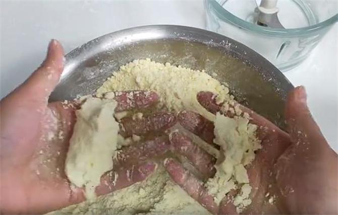 2.加水以后会有很多的小颗粒,我们可以过筛,或者是用料理机把它打细腻,粉的越细腻无颗粒,年糕就会越筋道,不会夹生。