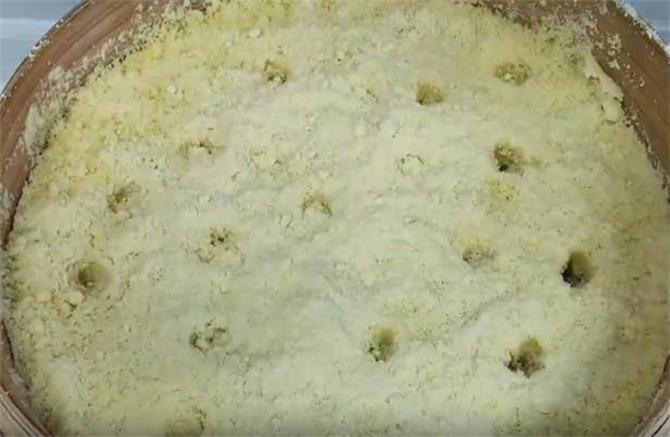 5.然后我们均匀的少量的撒上一层湿粉,待湿粉颜色变黄,也就是气体窜上来以后,我们再撒一层,千万不要着急,一定要是气体窜上来以后才能再撒,如此反复即可。