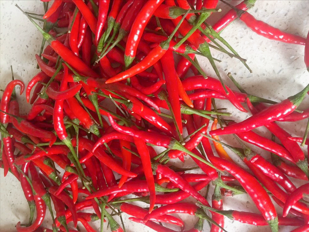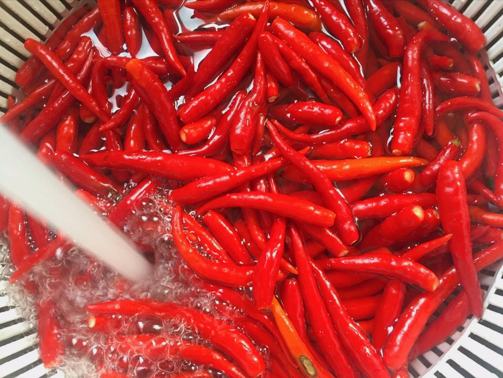 2、采摘回来之后,把辣椒硬蒂去掉,尽量戴上一次性手套,避免辣伤手指,接着清洗干净,控干多余的水分,一定要控干,带有水分的话,不利于长久保存。