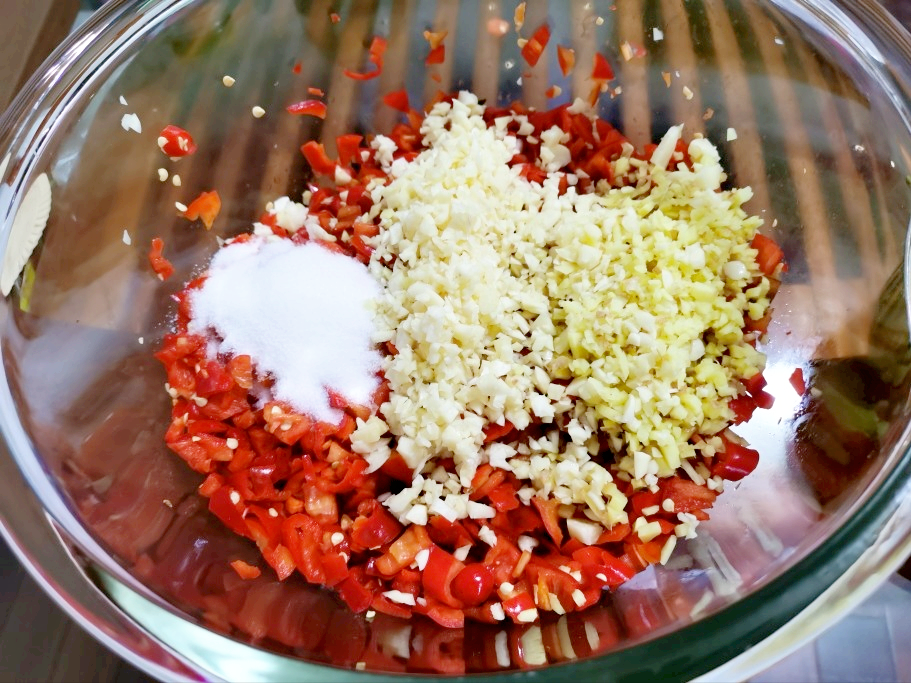 2、每斤辣椒所用到的用盐量,要把握清楚,500克辣椒放40克食盐就可以,适量的白糖可以缓冲辣度。