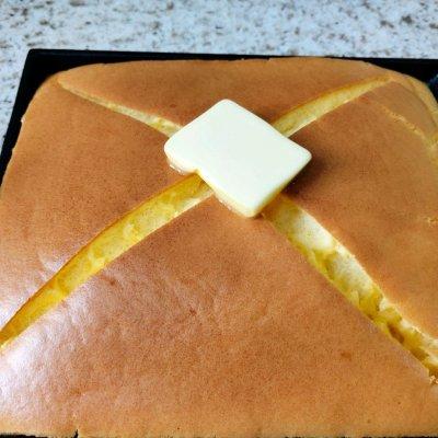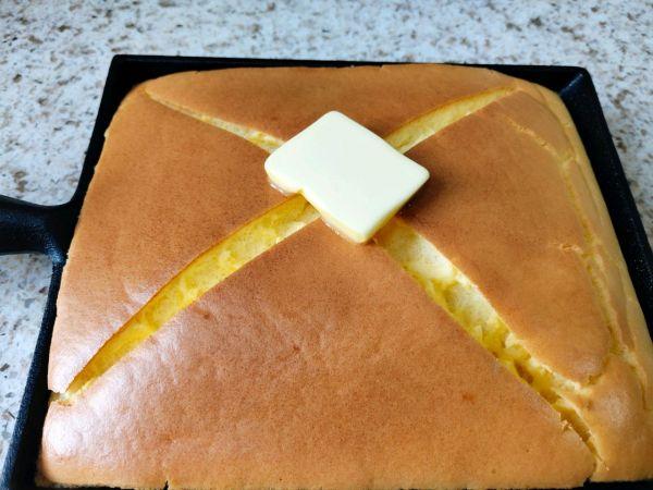 来自于《孤独的美食家》,中的蜂蜜蛋糕,但是我不能吃太多蜂蜜,就换成绵白糖,用铸铁锅烤制,上面放一片黄油,利用蛋糕的温度融化,口感轻盈!