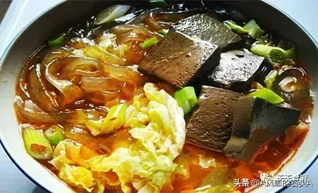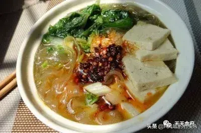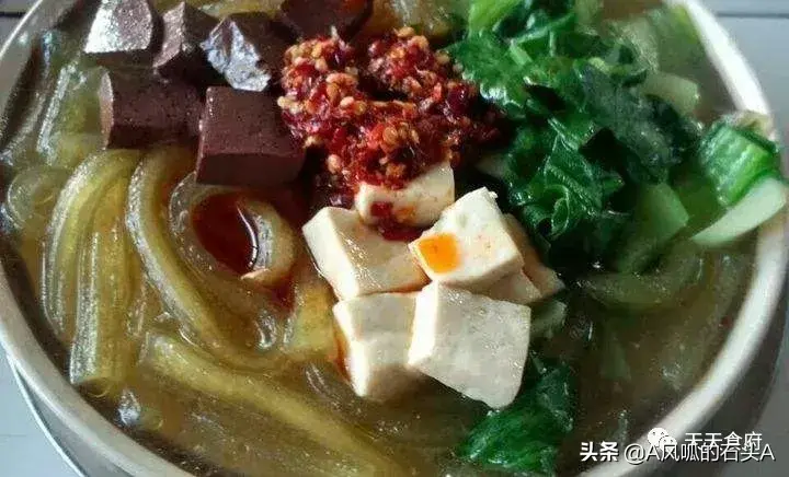 首先熬一大锅的高汤,将扁粉条下锅煮熟,再烩入豆腐片,猪血片和青菜。此处要特别提出一点,扁粉条在下锅之前应先用高汤泡制4~6小时,这样可以保证扁粉条更好吸收高汤的味道和营养。