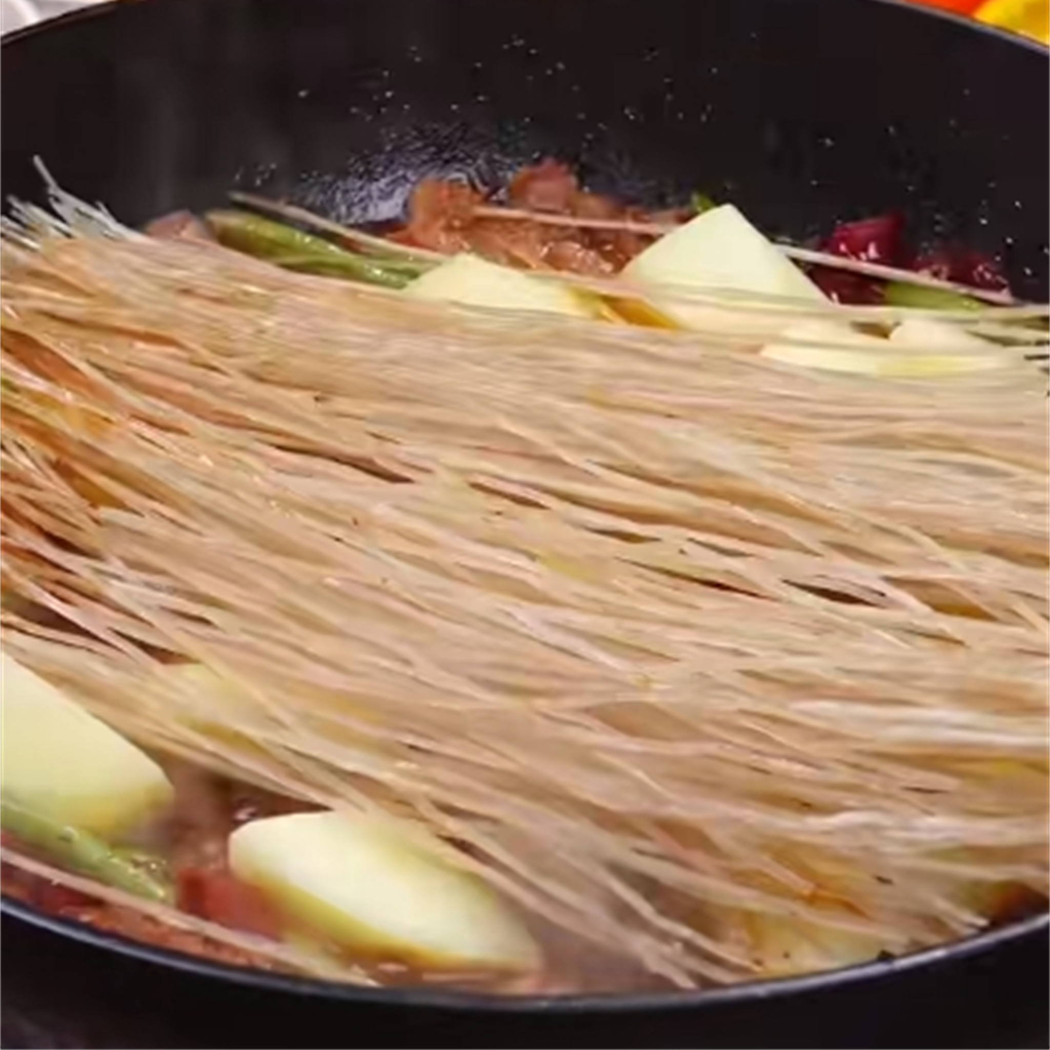 10. 加入面条,翻炒均匀,继续炖煮 5 分钟左右,至面条熟透。