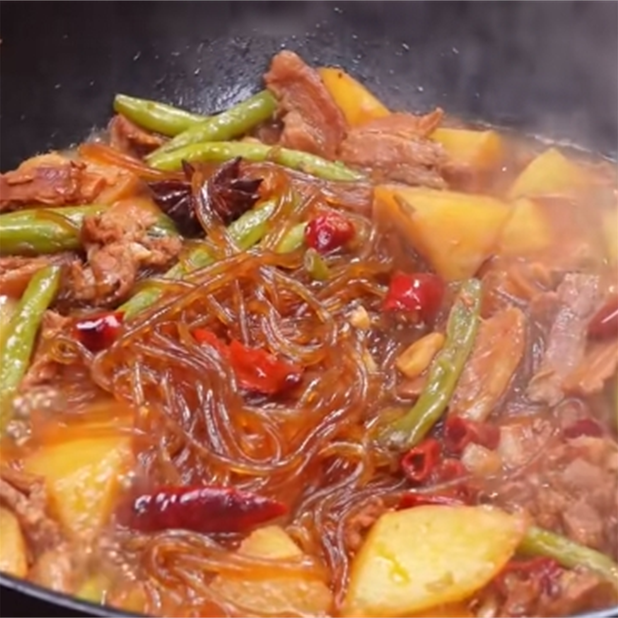 7. 加入土豆块和豆角段翻炒均匀。