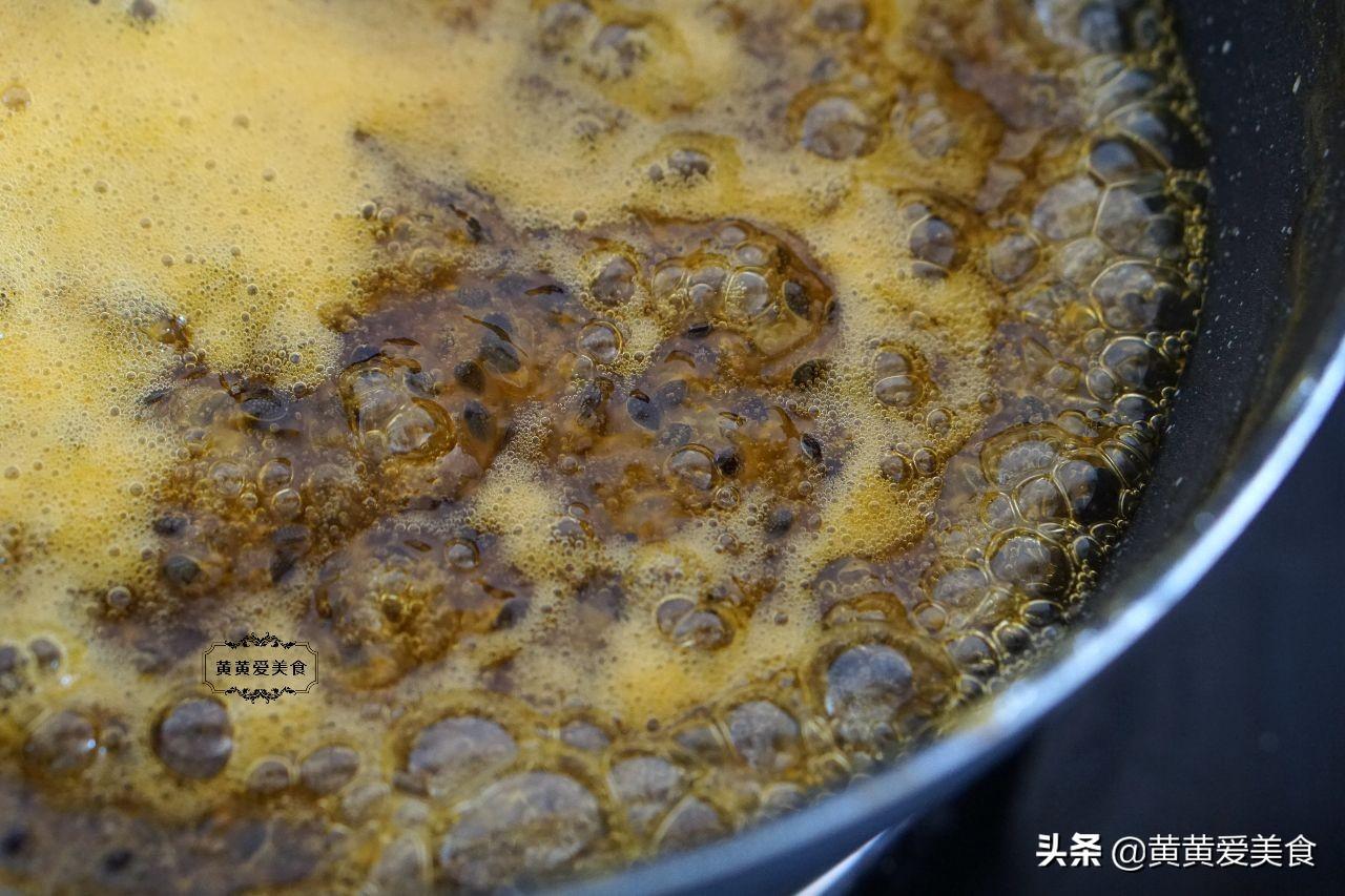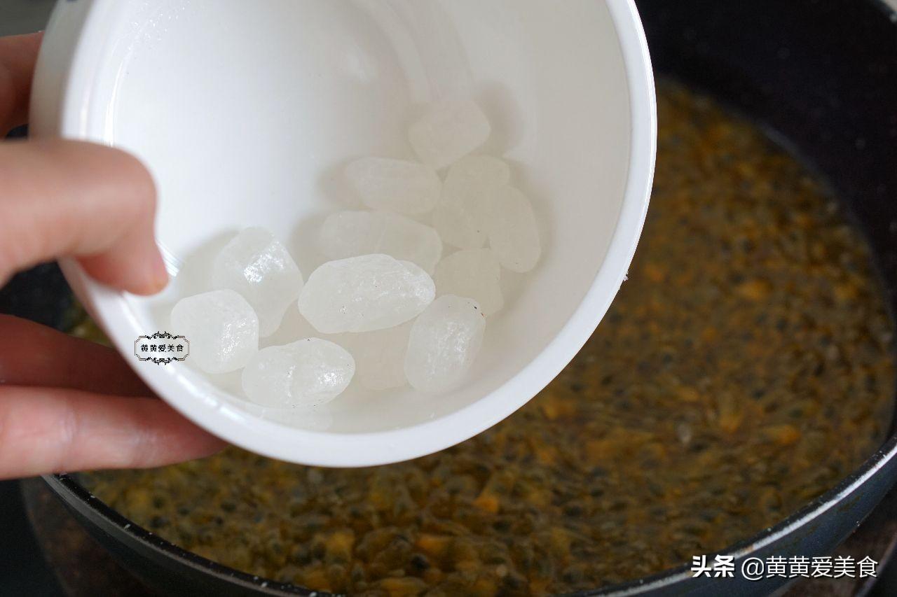 7、倒入冰糖,将冰糖熬至融化。