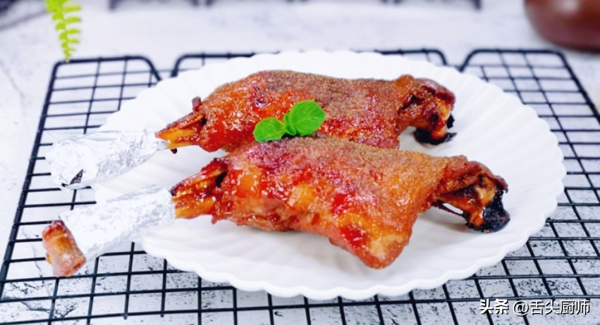 6. 出炉: 烤好后取出,用食用油均匀地刷在鸭腿表面,使得表皮更为脆口。