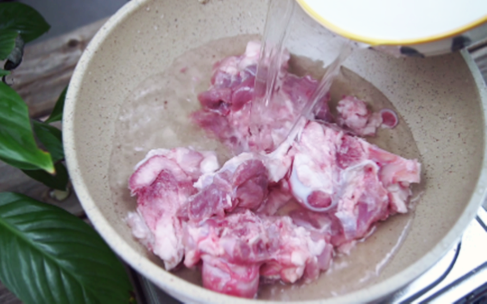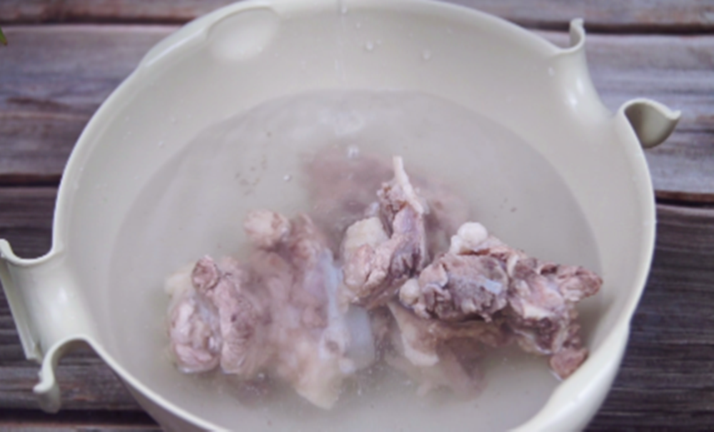 第三步:接着再煮五分钟,这时候就可以看到漂浮在上面的浮沫已经变成白色的了,这一层白色的浮沫就是骨头里面的蛋白质和营养成分,我们不需要把它捞走。五分钟之后就可以把骨头捞出来,接着加入三四十度的清水把骨头再清洗一遍,将它上面多余的油脂和杂质完全清理干净。这里一定要用温水清洗,如果用凉水清洗肉就会收缩变柴。