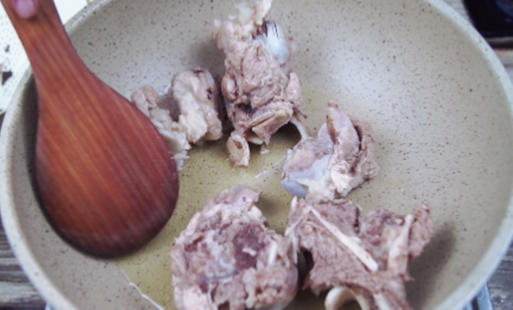 第四步:起锅烧油,往锅里面放入一些猪油,如果没有猪油用花生油也可以,处理好的骨头不要直接用来炖汤,油热之后将筒骨放入锅中煎炒一会,这样可以让筒骨里的营养激发出来,煮出来的汤汁就会浓白,而且炒过的铜鼓吃起来也会更加的香,很多朋友都省略了这一步,所以煮出来的汤非常的寡淡并且特别的腥,所以在炖汤之前一定要把铜鼓炒一下。