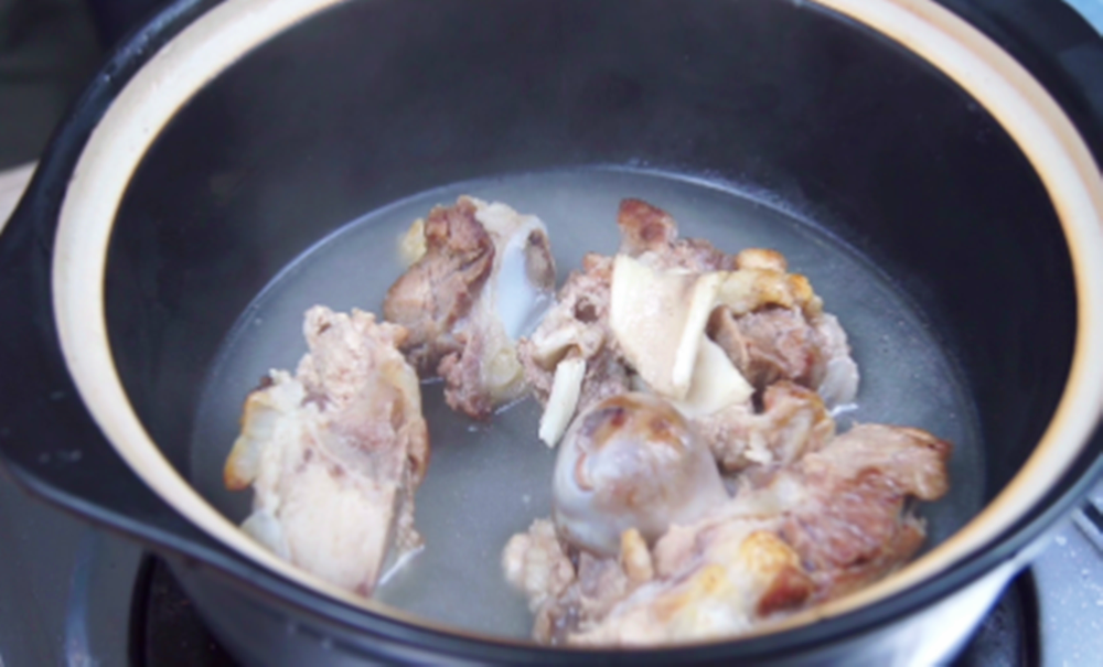 第五步:接下来这一步也很重要哦,先加一小部分的清水,不要没过筒骨,直接开大火煮,煮开就可以看到汤水已经是乳白的。大概十秒之后再加入热开水,这里是可以一次性加够,然后开大火煮个两分钟,水开之后再把漂浮在上面的一层油脂撇掉,这样骨头汤喝起来才不会油腻。接下来再给骨头汤换一个砂锅,用砂锅炖出来的汤会更加的好喝,盖上盖子炖个二三十分钟。