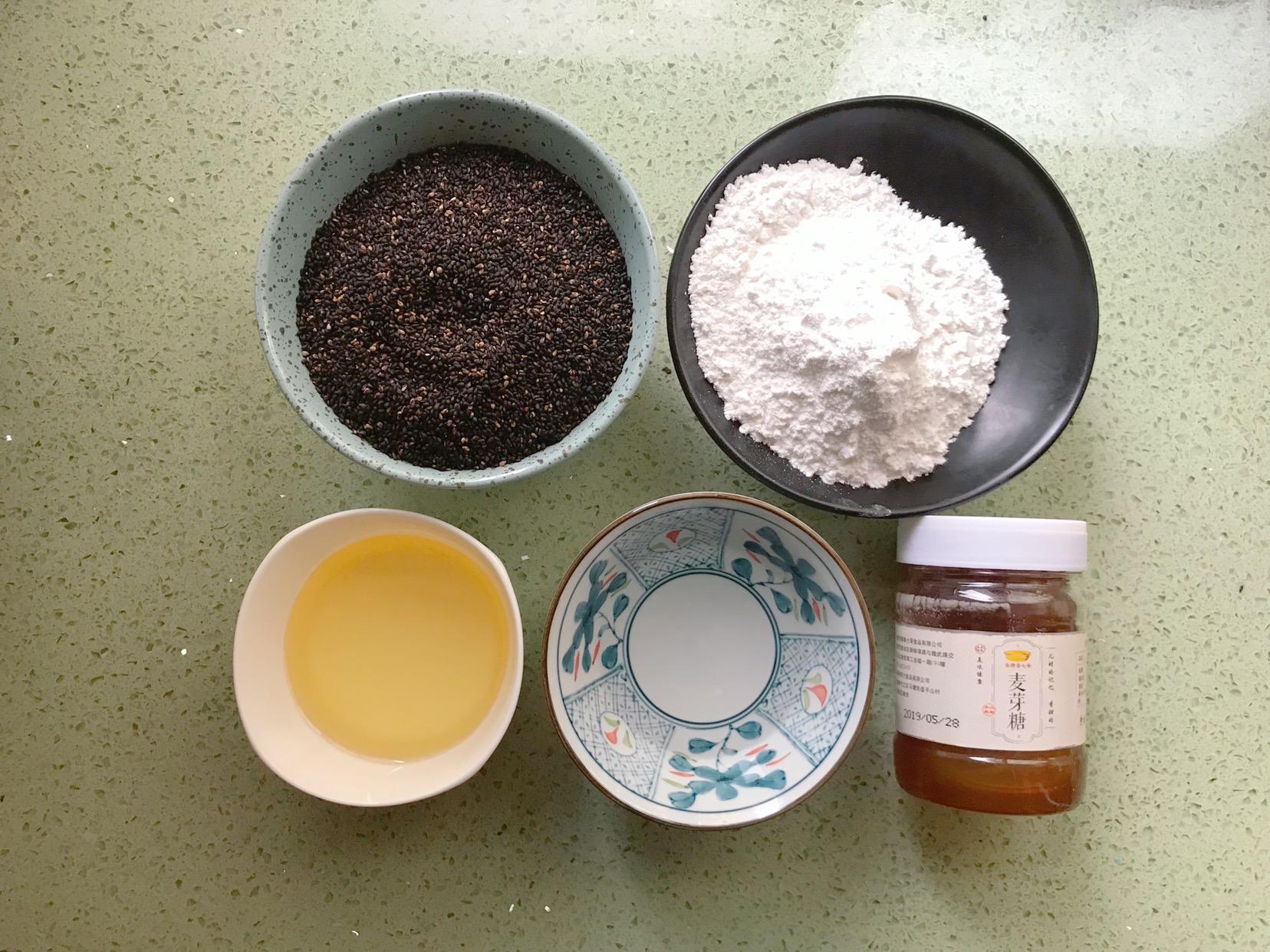 馅料:熟黑芝麻300克、糯米粉120克、花生油70克、麦芽糖80克、蜂蜜20克、凉白开适量