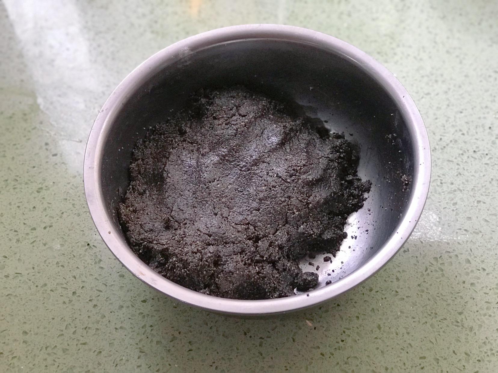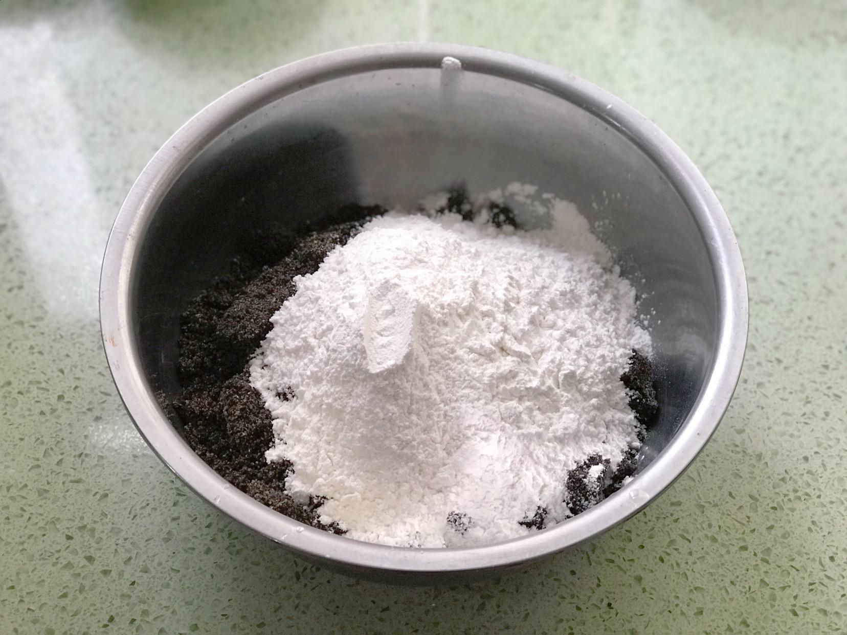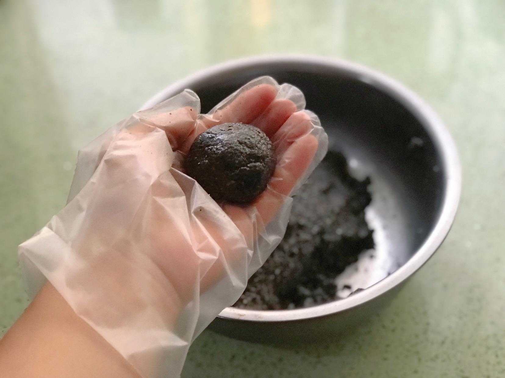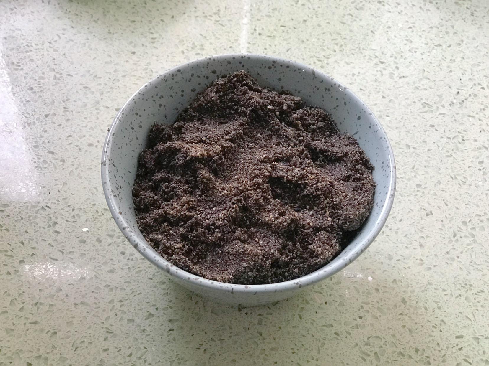 至于凉开水倒多少,可以这样操作,先将黑芝麻与其他的材料搅拌,然后缓缓地少量多次地加入水,直到黑芝麻面团软硬适中,能揉成团即可。