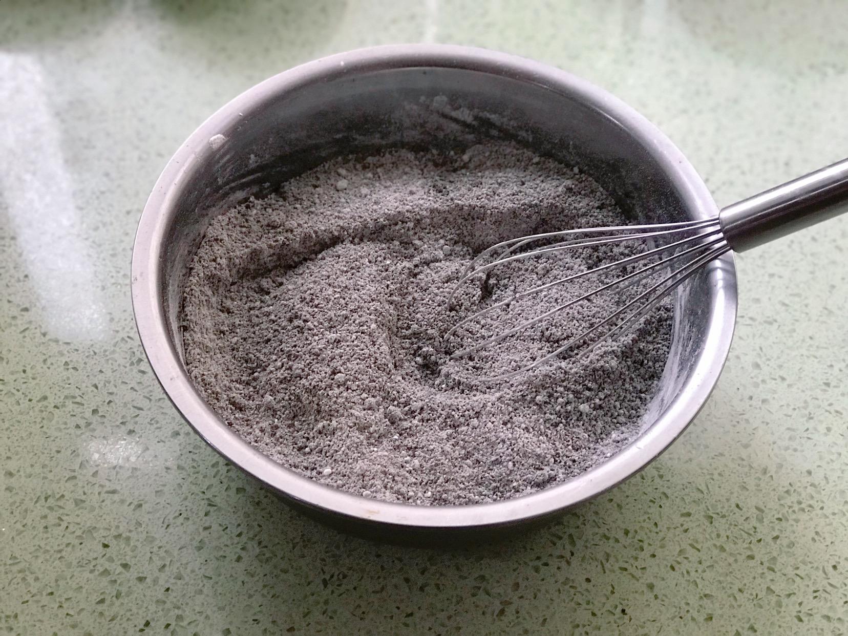 3、将打好的黑芝麻粉放进盆中,加入炒好的糯米粉,用手动打蛋器将黑芝麻粉与糯米粉混合均匀。不一定非使用打蛋器,也可以使用其他的工具,手也可以,只要是搅拌均匀即可。