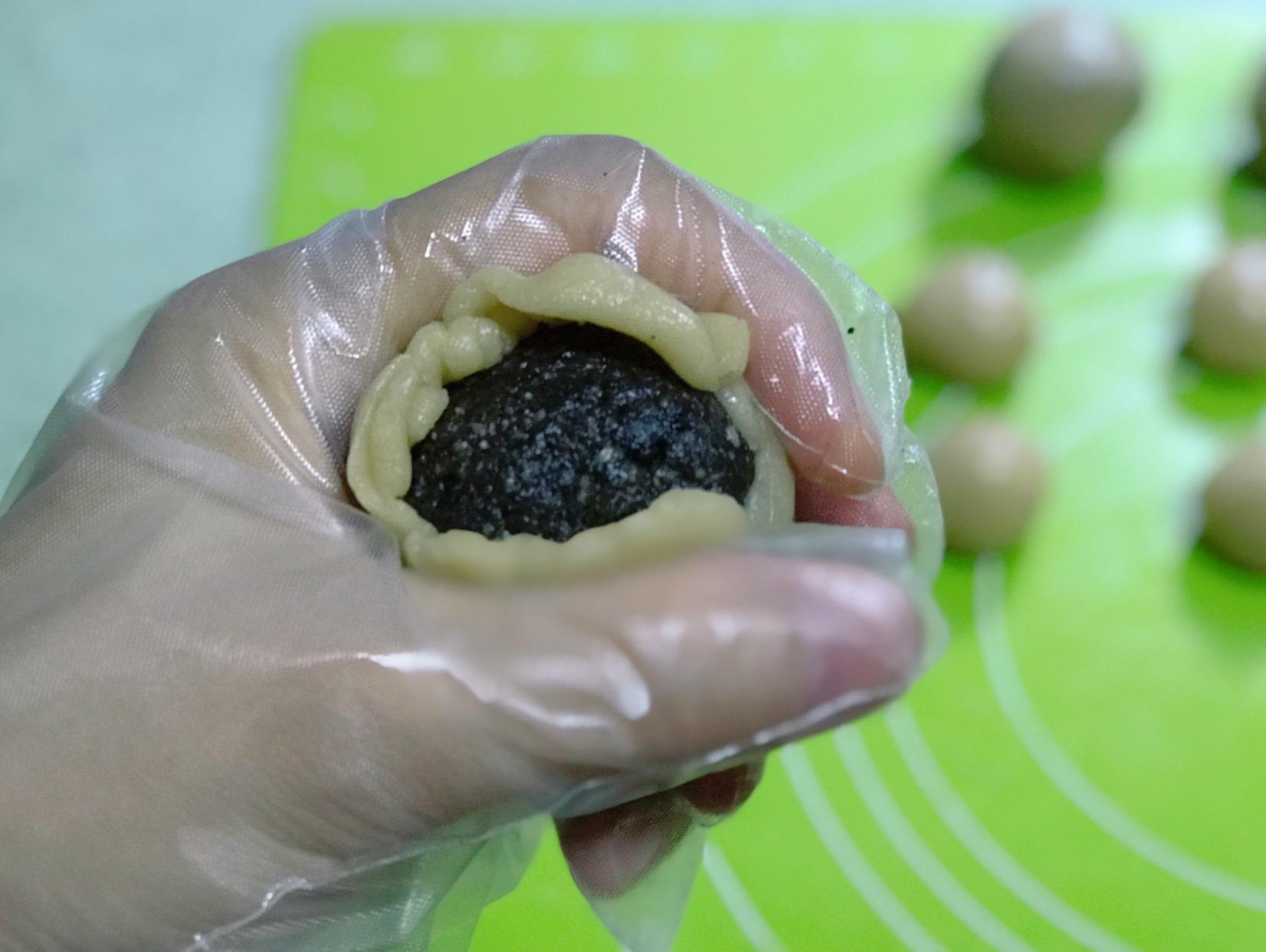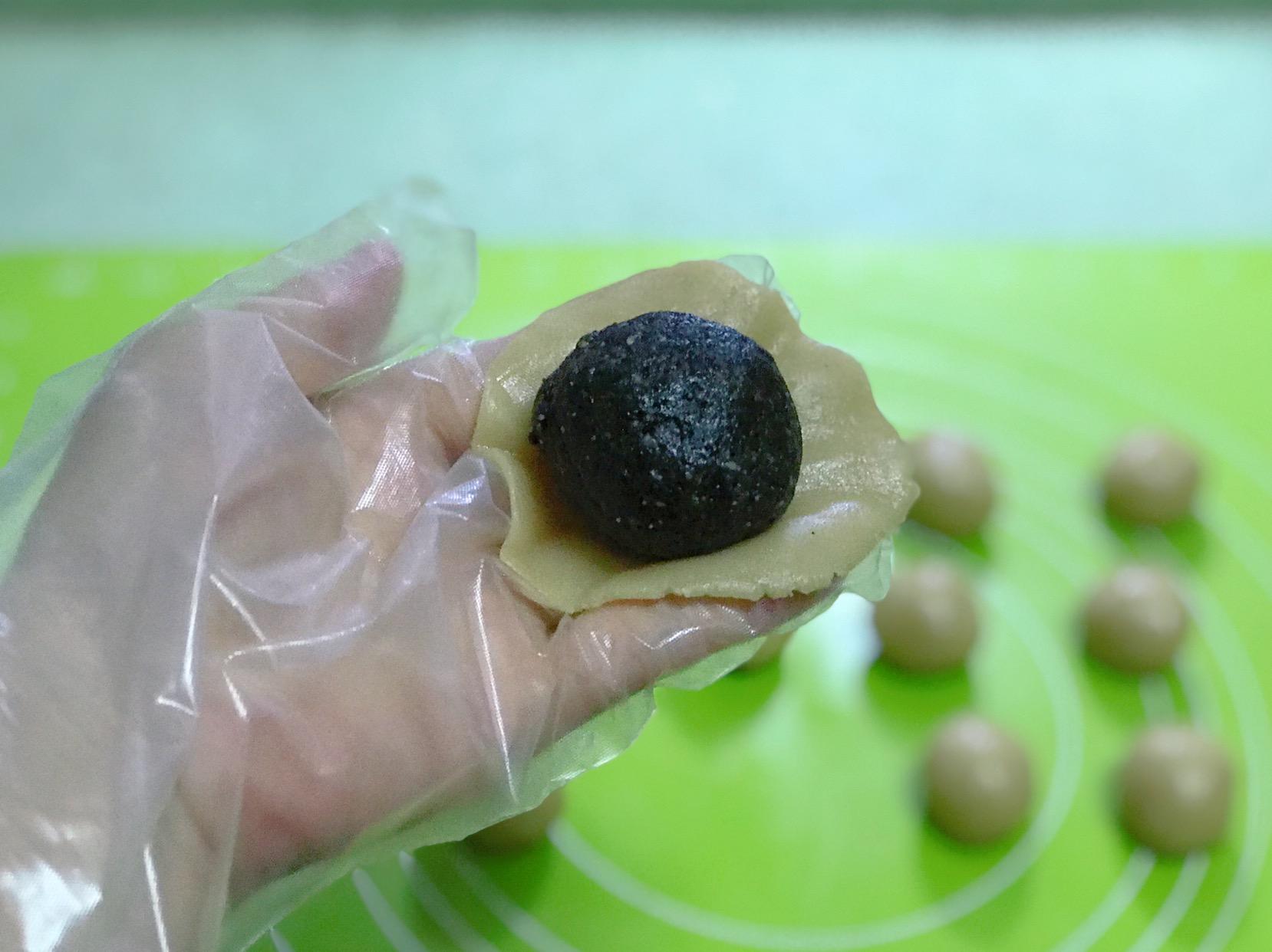2、取一个剂子用手压成面饼,将提前准备好的黑芝麻馅放在面皮上,用虎口部分向上推面团,慢慢地将馅料包住。月饼饼皮虽然非常易破,但是它的可塑性也很强,破了再修补一下就可以,要有耐心和足够的信心,这样才能完成这美味的糕点制作。