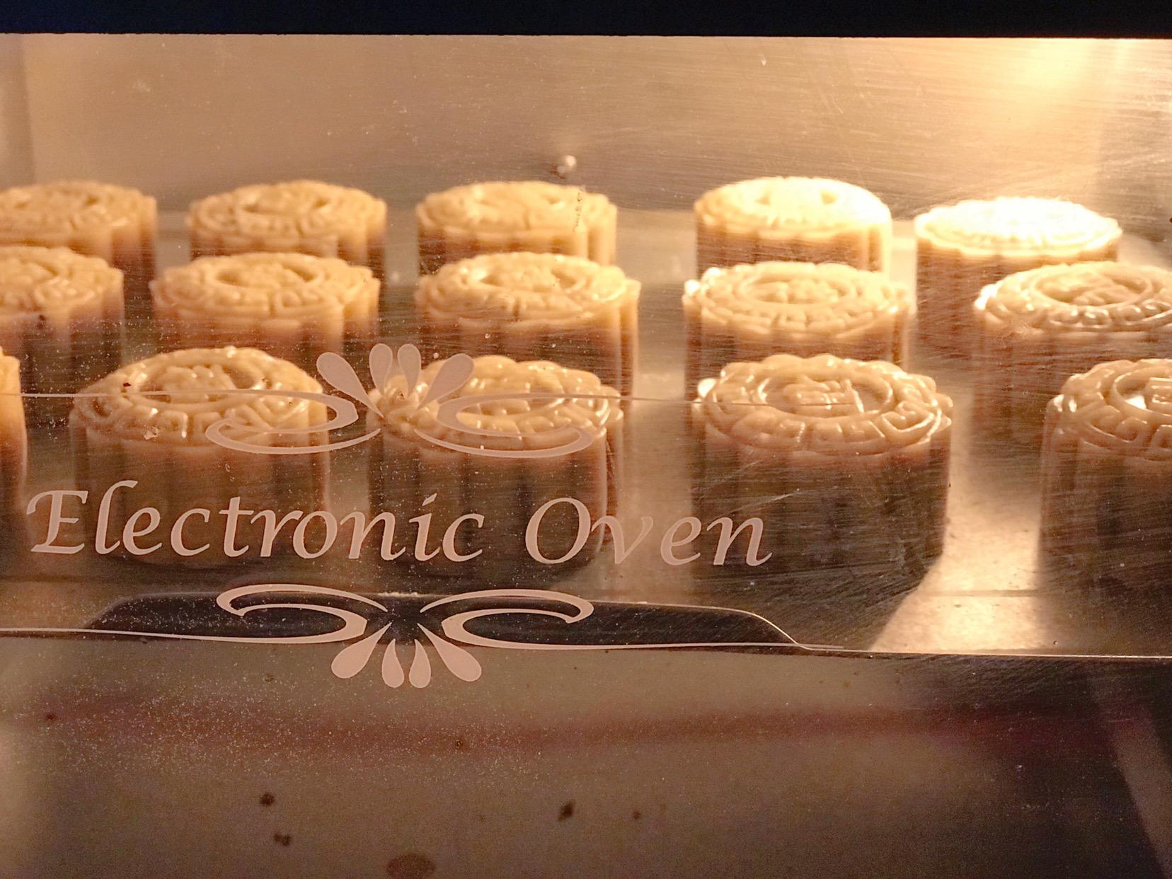 4、烤箱提前200度预热10分钟,上下火180度,放入烤箱中层烤五分钟进行定型。在将月饼放入烤箱之前,用小喷壶在月饼的表面喷一层水,这样可以防止月饼烤的时候干裂。