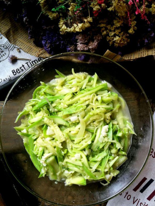 3、小瓜冲洗切丝、蒜剥皮切碎。