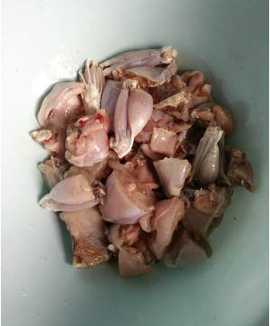 第一步:牛蛙洗干净切块,两只大的够小两口吃两顿了,加黄酒两勺,盐一勺腌制半个小时左右。