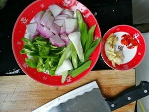 第二步:青椒(也可加入红椒更好看)洋葱切片,大蒜,生姜,干辣椒切小块备用。