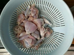 第三步:腌制好的牛蛙会出水,还有多余的黄酒,用篮子滤干备用。