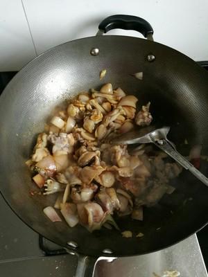 第五步:大火倒入牛蛙快速翻炒至牛蛙肉质发白,加入一匙黄酒,两匙生抽继续翻炒至牛蛙染上生抽颜色。