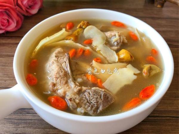 做法:全部食材处理好洗净,龙骨焯水洗净,把除了枸杞以外的所有食材放入锅里,加入足够的水,大火煲15分钟,转文火煲2个小时,加入盐调味,再入枸杞即可。
